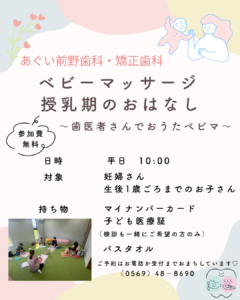 2026.04.11 院内セミナー🦷ベビーマッサージと授乳期のおはなし👶🏻 こんにちは🌞 あぐい前野歯科・矯正歯科です🦷🪥 次回院内セミナーは5/19(火)10:00 ベビーマッサージと授乳期のお話しです👶🏻🩷 あと2枠空きがございますので、気になる方はぜひ 当院までご連絡くださいね🤗